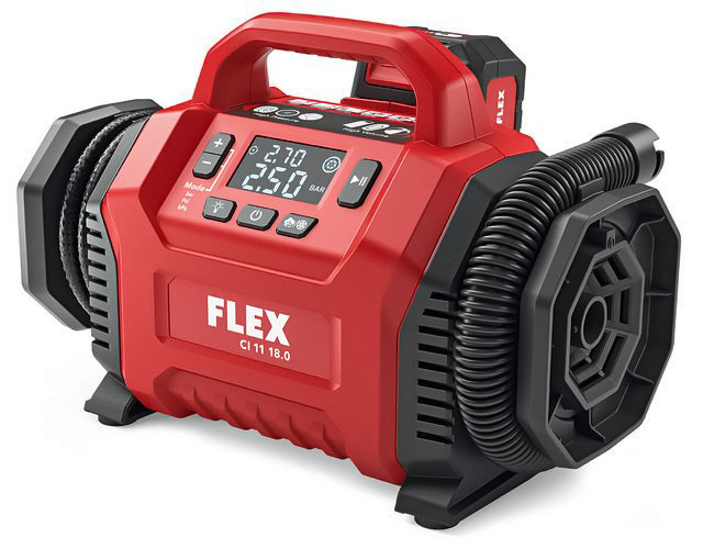 Matalapaine ulostulo – maksimi. Paineenilmaisin. 12V:n sisäinen jännite (savukesovittimen kautta). Suorituskykyluokkansa pienin paino, vain 1,9 kg! Silti vankka painevaletun alumiinirunkonsa vuoksi. Ergonominen kahvan asento helpottaa kuljetusta. Sisäänrakennettu LED-valo. LED-ilmaisin osoittaa akun varaustilan. FLEX akkujärjestelmä soveltuu kaikkiin uusiin 18,0 V FLEX-työkaluihin.