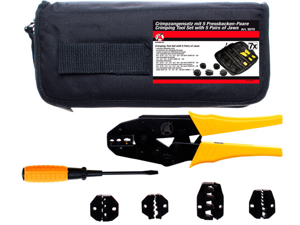 7-osainen johtoliitinpihdit vaihtoleuoilla. Mukana 5 leuat sekä ruuvimeisseli, jolla vaihdat kätevästi leuat. Voidaan käyttää eristetyille sekä eristämättömille liittimille, pääteholkeille, yms.