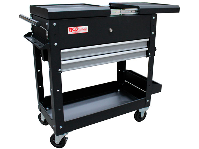 Työkaluvaunu BGS-4105 iso säilytystila kahden avattava kannen alla kumimatolla päälystetty. Säilytystilan koko 700 x 360 x 170 m. Kaksi vetolaatikkoa (565 x 320 x 55 mm) reikälevy ruuvimeisseleille. Tila spraypulloille. Iso säilytystila alaosassa (pohjalevy) pidin paperirullalle 275 mm. Ulkomitat 875 x 370 x 840 mm